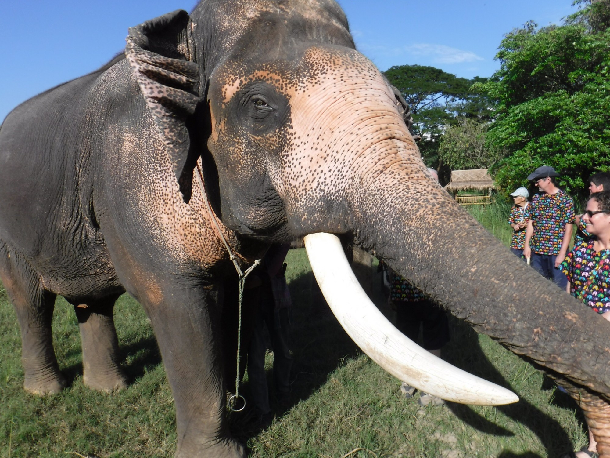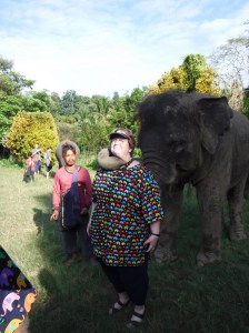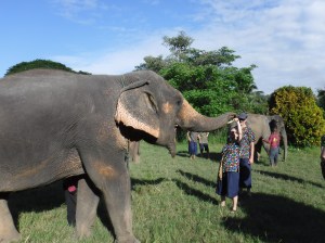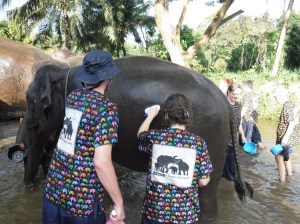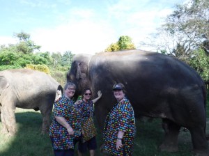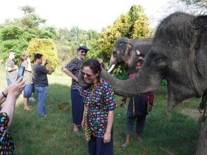 Then 10 of us went to Kanta, an elephant sanctuary. It took us 1.5 hours to drive there, and the air wasn’t working well, so we were miserable, but having fun anyway. When we arrived, we changed into these ugly outfits (blue pants and a nurse like shirt with elephants on it). Then we each filled a bag with as much sugar cane as we could fit, elephants think this is like candy. We walked down to the field where 5 of the 10 elephants were in a field grazing (2 boys and 3 girls, I think). We received instructions on how to hold the food so they could grab it with their trunk. The first time each of us did it, it was a little weird, but we got the hang of it. Some of the elephants,wanted a bunch of the cane before putting it in their mouth. We could touch them anywhere except their eyes and mouth. Their skin was so rough, the hair on the side of their was like a bristle. Many of us got a kiss from the trunk of one of them. Next we walked to a creek to bathe the elephants. Bowman stayed dry for fear of hurting her ankles. We had a bucket and a brush like the one I use to clean my bathroom. We walked into the knee deep water and used the bucket to throw water on the elephant. We all got soaking wet, not just because of the elephants, nut their trainers were also throwing water on us. We scrubbed the elephants with the brushes, and just had plain fun with them. It was a unique experience with these gentle and stately animals, a day that none of us will forget.