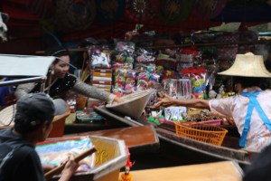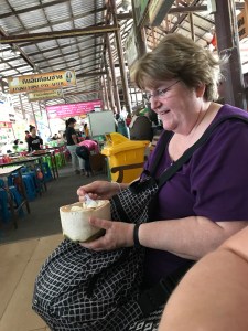 Next we drove to the floating market. Eadie and Mike told us this was more of a tourist destination then true market, but it was still pretty cool to see how the market used to be. While I would have preferred a different market, the others were farther away and Amy said this was the only one left. We arrived at a good time, before the buses arrived. Cloe, Mary, Karen and Brenda took a boat ride, while Bowman and I walked around, shopped, had some coconut ice cream, and enjoyed people watching. It was quite dicey watching people get on and off the boat. No one tipped over but it was close. In the market, I found some salt to buy, and you had to bargain everything done at least 50%. Bowman bought a scarf for 200 baht, but it started at 650. Very impressive bargaining.