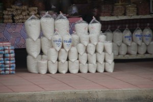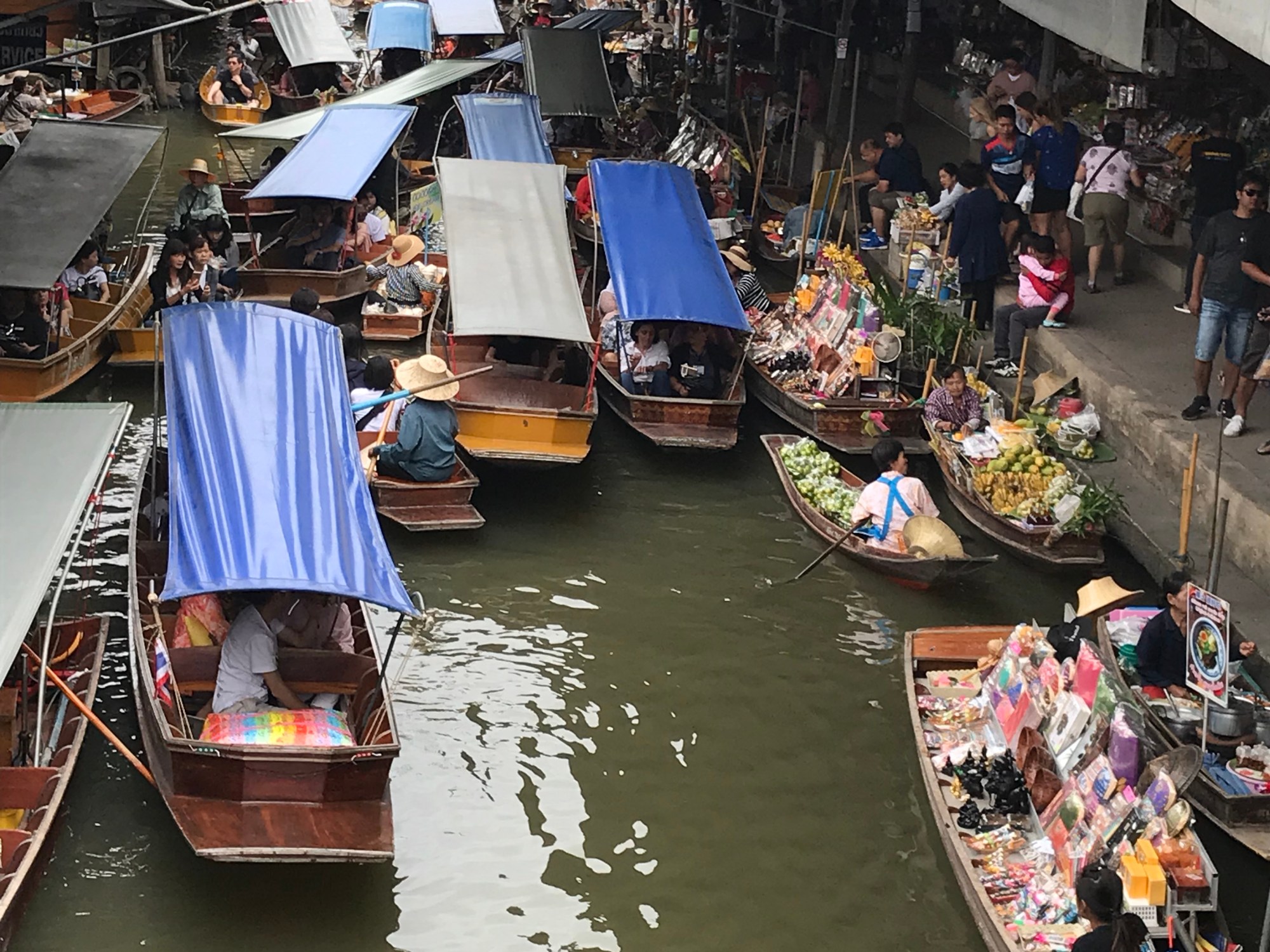I think I have finally hit the wall and will need a vacation from my vacation. This morning Bowman and I chose to go with 4 others to visit the Maeklong Railway market and Damnoen Saduak floating market. We had to leave at 7am this morning, and when the alarm went off at 6am, I was regretting our decision to go. But that changed. It took us over an hour to get to the Railway market, and on the way there we drove past acres upon acres of salt ponds, and thousands of bags of salt for sale. It would have been cool to stop and learn about this, but wasn’t in our plan for the day. I did a little research and these ponds are flooded with shallow sea water. These are left for around ten days until the sun evaporates all the water, leaving the salt to be collected and carried away in shoulder baskets to be bagged. This means it is very much a weather reliant industry and takes place in the hot season. It is hard and heavy work, and the salt means there is very little vegetation around to give shade to the workers.