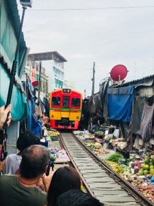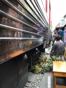 We arrived early and in time to ensure we had a good spot for the 8:30 am train. Seventeen trains run daily in each direction between Samut Sakhon and Wongwian Yai. There are multiple food vendors that set up stands right next to the train tracks. And I really mean right next to them. Whenever a train approaches, the awnings and shop fronts are moved back from the rails, to be replaced once the train has passed. We got to see the train pass through twice, and it was quite amazing. When the train wasn’t there, people walked on the tracks and shopped. We stopped at a coffee shop to sit, have a drink and watch the train. I was sitting on a small wooden bench and when we heard the train coming everyone started moving, not as many awnings were out because it was overcast, but everyone was preparing for the train. It approached slowly, and I wasn’t sure that my knees were safe, but the shop owner kept saying “you ok, you ok,” but I still moved them to the side just in case. We could touch the train as it passed us. People on the train waved at us. And then when it was through, everything went back to the way it was. When the second train passed, the shop owner gave the conductors two drinks that they picked up on their way through.