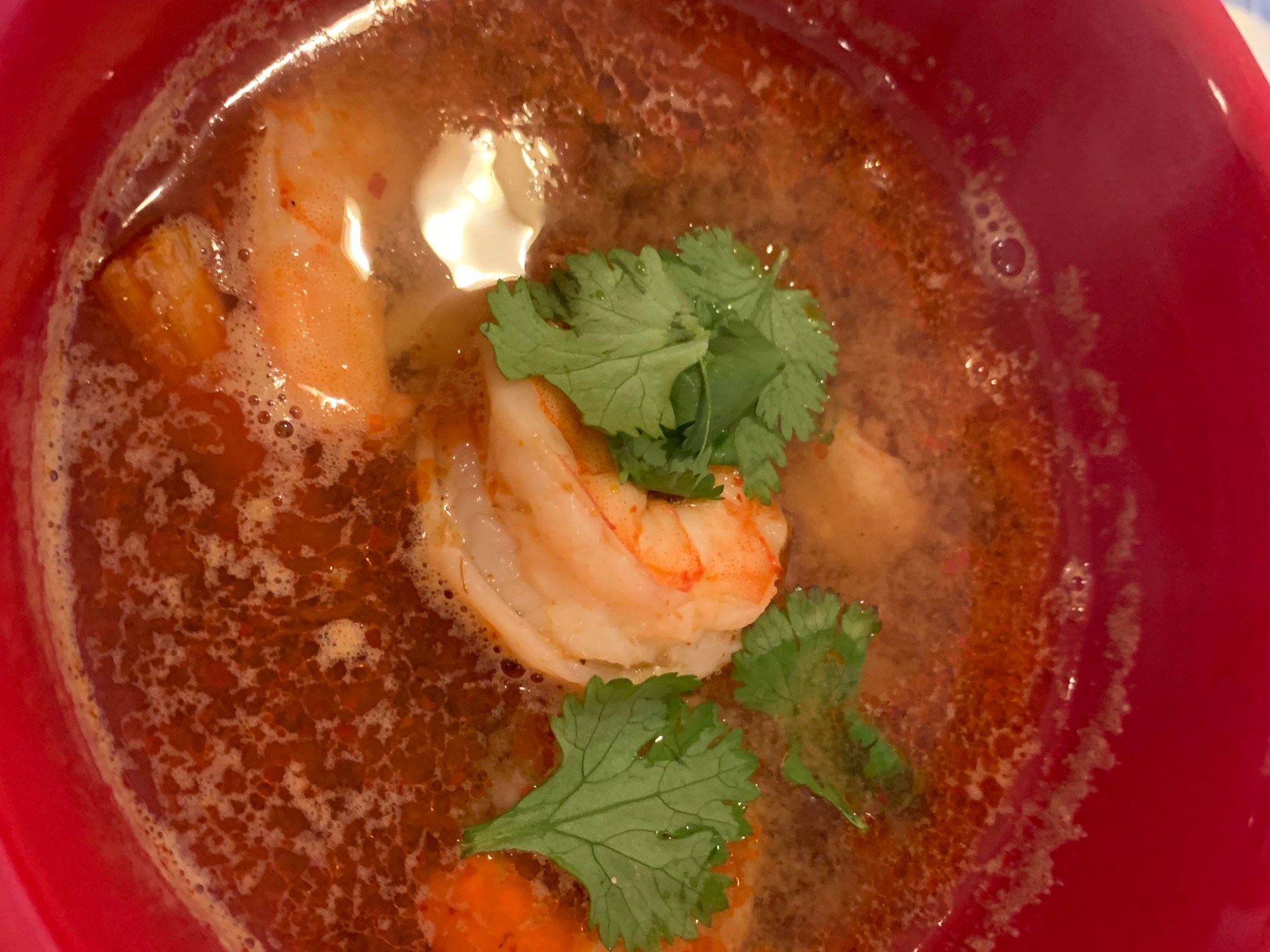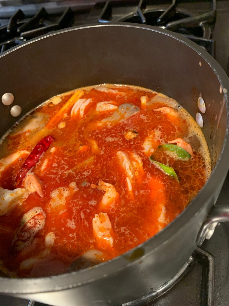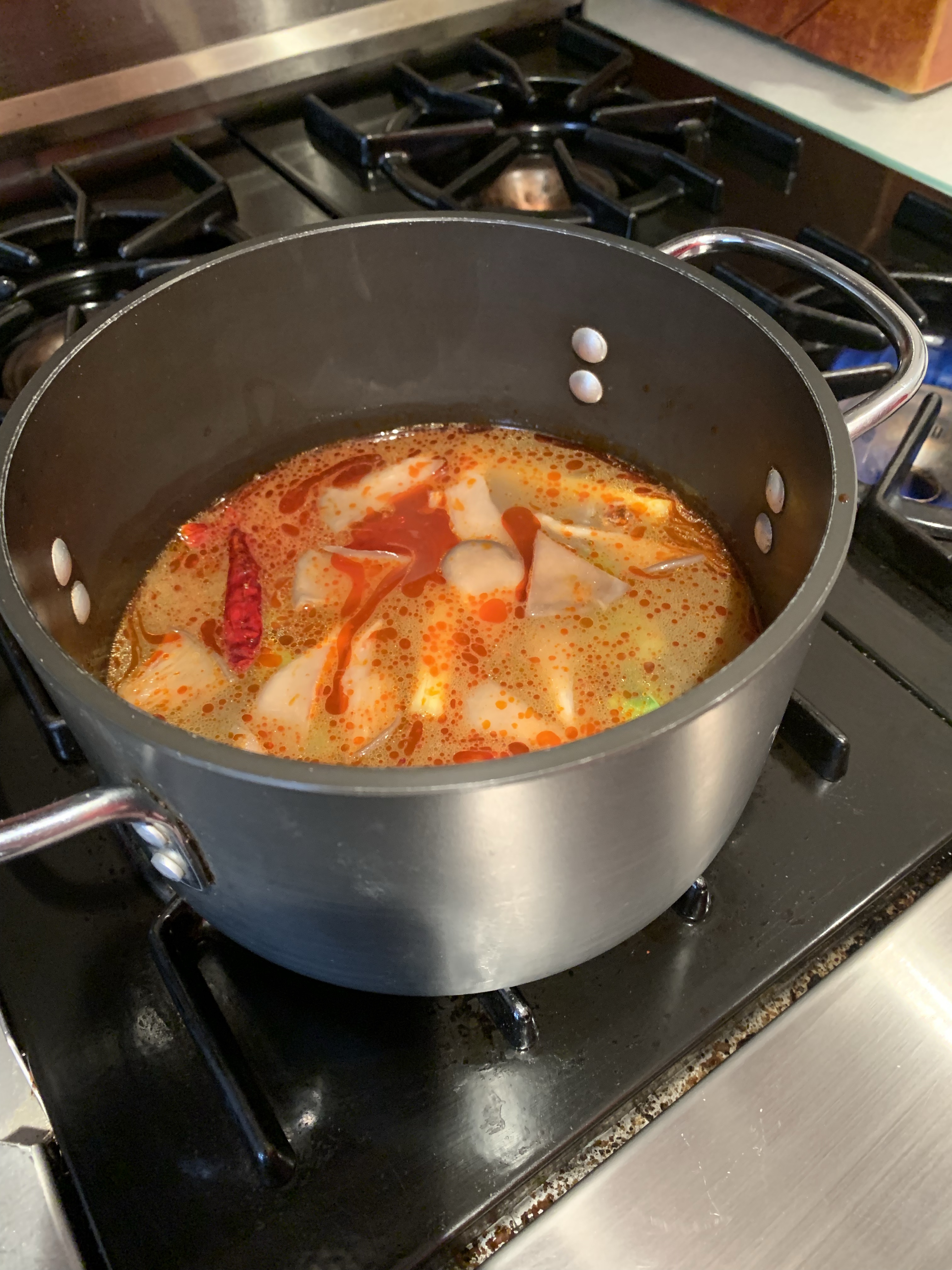 To prepare the meal, we put the shrimp stock in a pot, added the ingredients above along with Oyster mushrooms, lemon grass, and brought it to a boil. We were concerned there wasn’t enough shrimp stock, so we added some fish stock to increase the volume. Then we added shrimp, fish sauce, and lime juice. Once the shrimp was cooked, he added lime juice and cilantro for garnish ladled into a bowl and sat down for lunch.