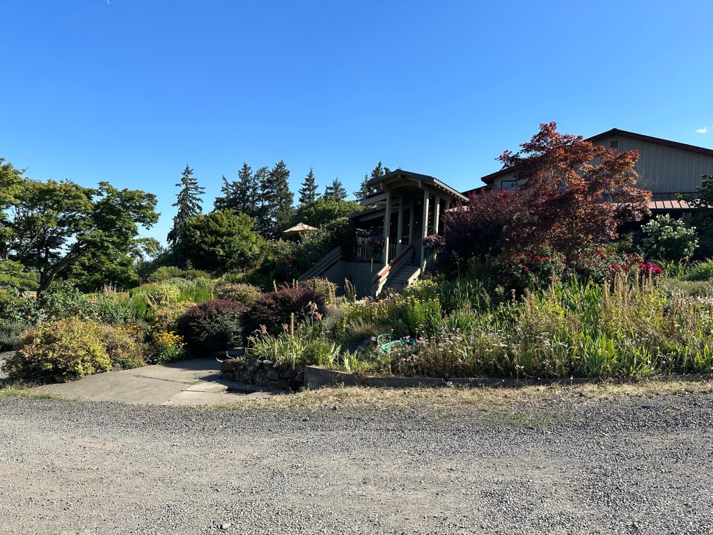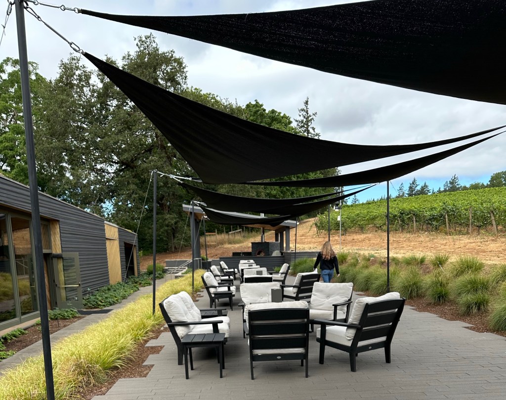 This vineyard was one of the first in Oregon, created by a husband and wife team in 1971 – Bill Blosser and Susan Sokol. We didn’t get to meet Susan, but we saw her on the property walking around. The winemaker is a woman, one of the few around. Sokol Blosser has survived, grown and prospered as a family-owned and run operation, and they are proud to have been part of developing and shaping Oregon’s now prominent wine industry. The Vineyard has grown to over 120 acres. The winery is located in the Dundee Hills of Dayton, OR. The building and grounds were breathtaking. The 5,700-square-foot building is clad inside and out with striated wood that draws inspiration from the vineyard rows. The centerpiece is the tasting room, which includes a bar, outdoor terrace, sitting area and hearth, and is flanked by a library and kitchen. The building is organized to accommodate a variety of tasting experiences in each distinct space.