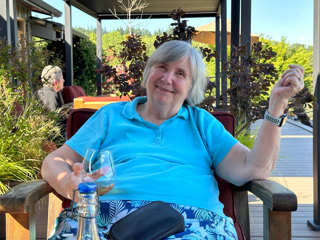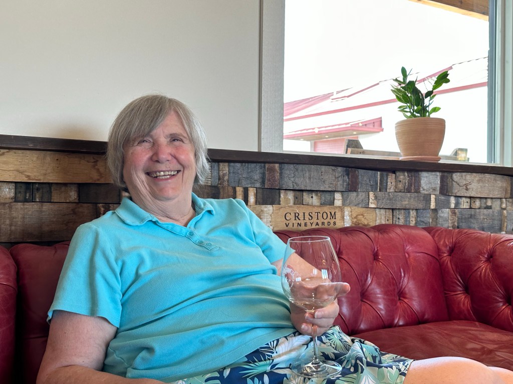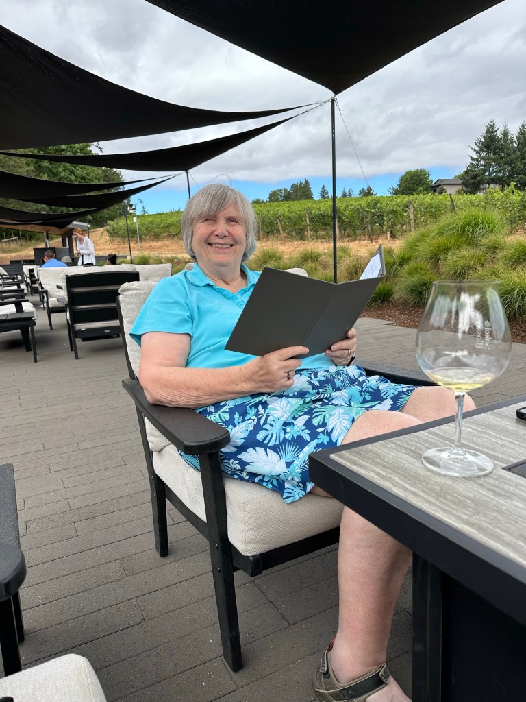 Our last stop was Cristom wineries located in Salem Oregon. The Cristom name was a combination of the two owners children’s names combined – Cristina and Tom. We didn’t have enough time for a tasting so mom just ordered one glass of wine. The only thing they had opened in a white was a Pinot Gris. The ambience was peaceful. The sun was lowering, so not blazingly hot, and there is soft music playing in the background that made you just want to close your eyes, enjoy the moment, and take in your surroundings.