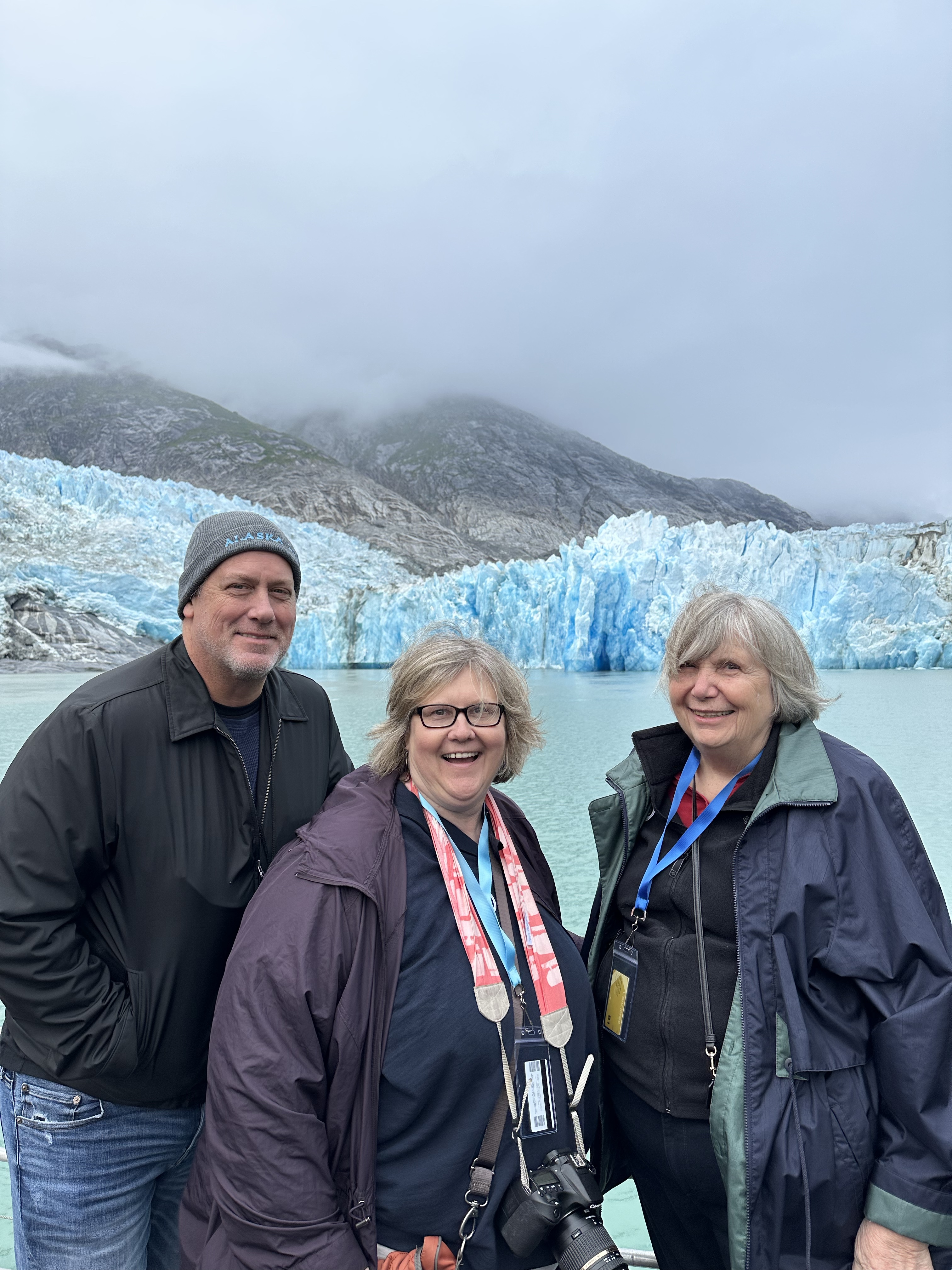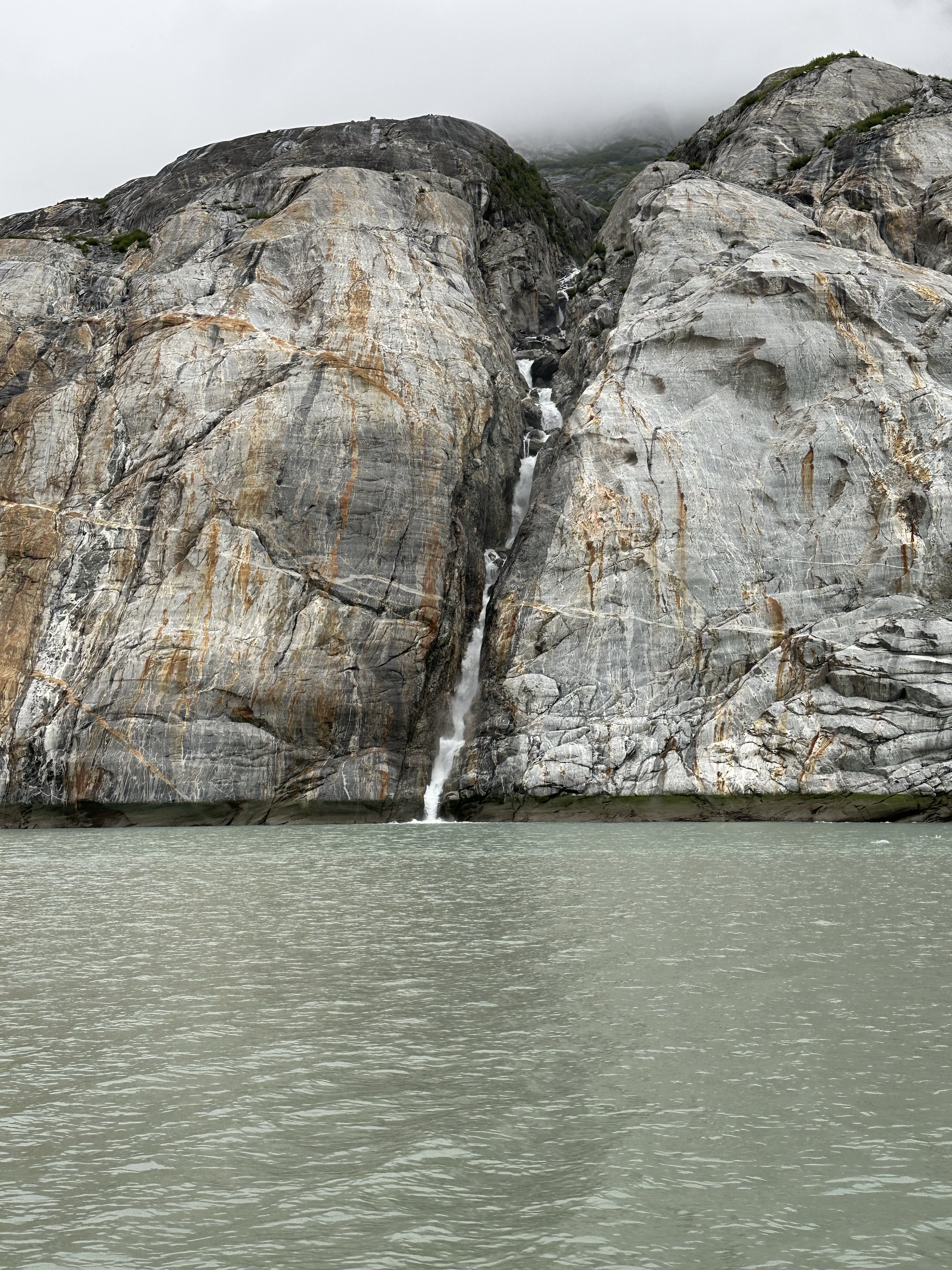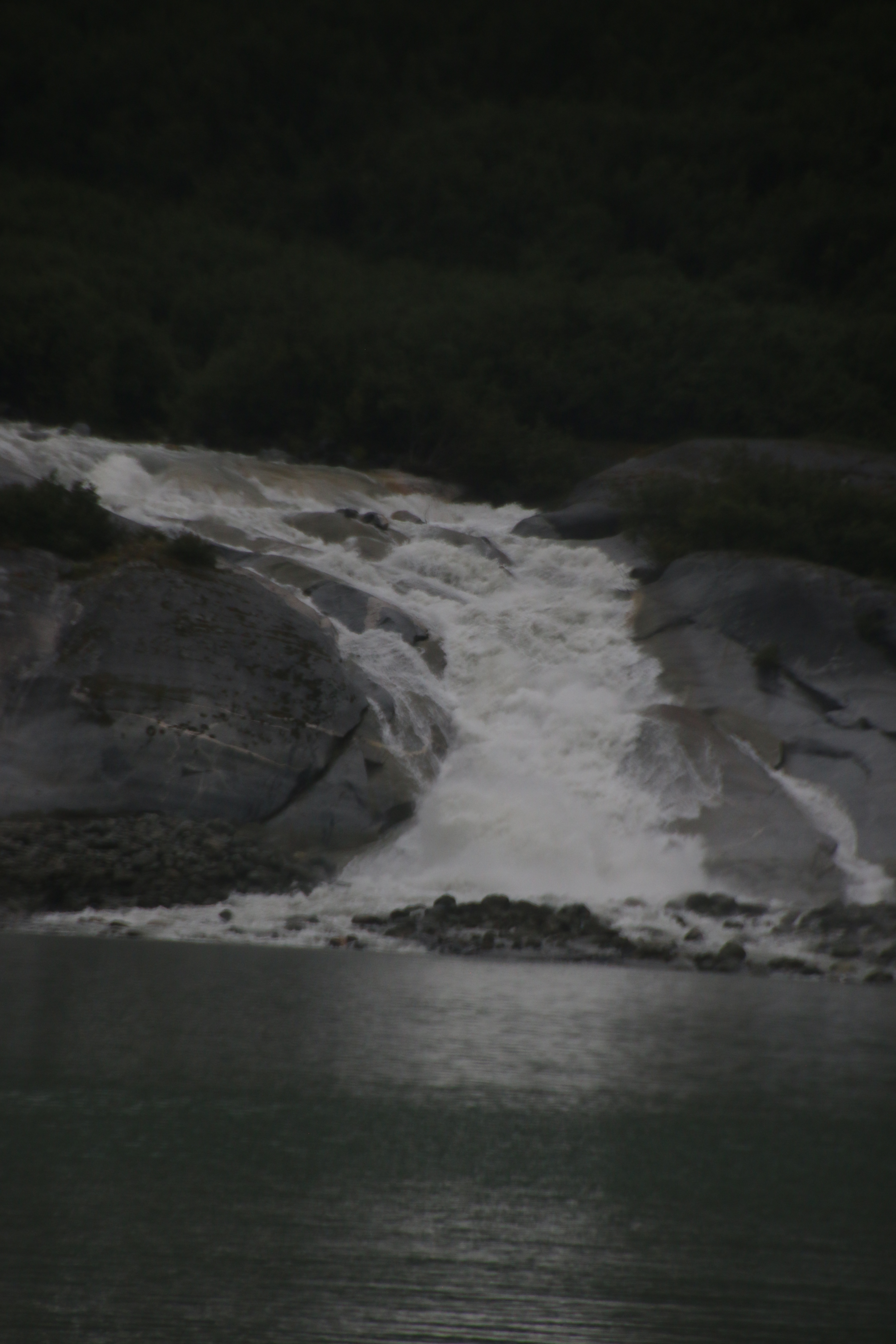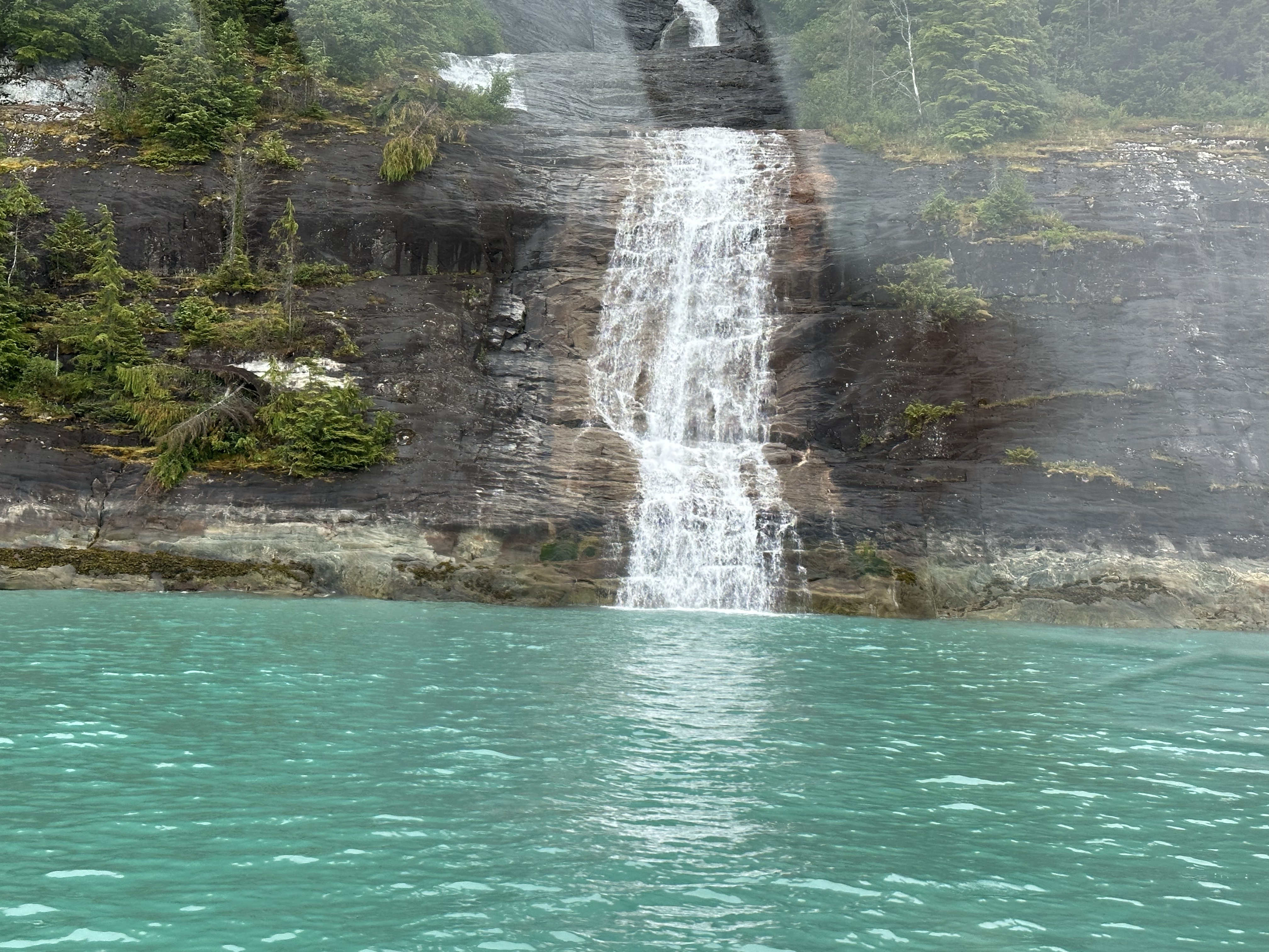 The captain of our boat took us close to the glacier, there were beautiful, icebergs, scattered everywhere, waterfalls, and cascades, flowing down from the mountains and ahead of us, the Dawes glacier. We waited. We waited