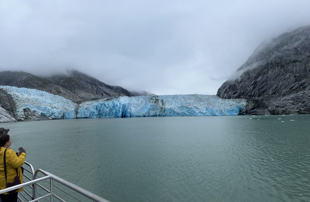 We set an early alarm for 5 AM because our excursion to the Endicott Arm Fjord, and Dawes glacier started at 7:15 AM. This glacier is located at the end of a glacier-carved fjord called Endicott Arm, which is off of the Stephens Passage seaway in southern Alaska. It’s protected within the Tongass National Forest, Dawes Glacier was originally named “Young Glacier” in 1880 by John Muir. In 1892, the U.S. Coast and Geodetic Survey changed it to its current name in honor of Massachusetts lawyer and statesman Henry Laurens Dawes. Over 600 feet tall and around one mile broad, Dawes Glacier is a mighty remnant of an even bigger ice block that forged Endicott Arm Fjord thousands of years ago. Consisting of two massive glaciers and combined by a medial moraine at the middle, Dawes Glacier covers 250 feet of ice underneath the surface of the glacier.