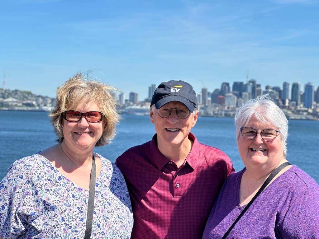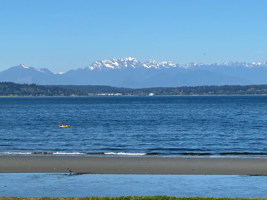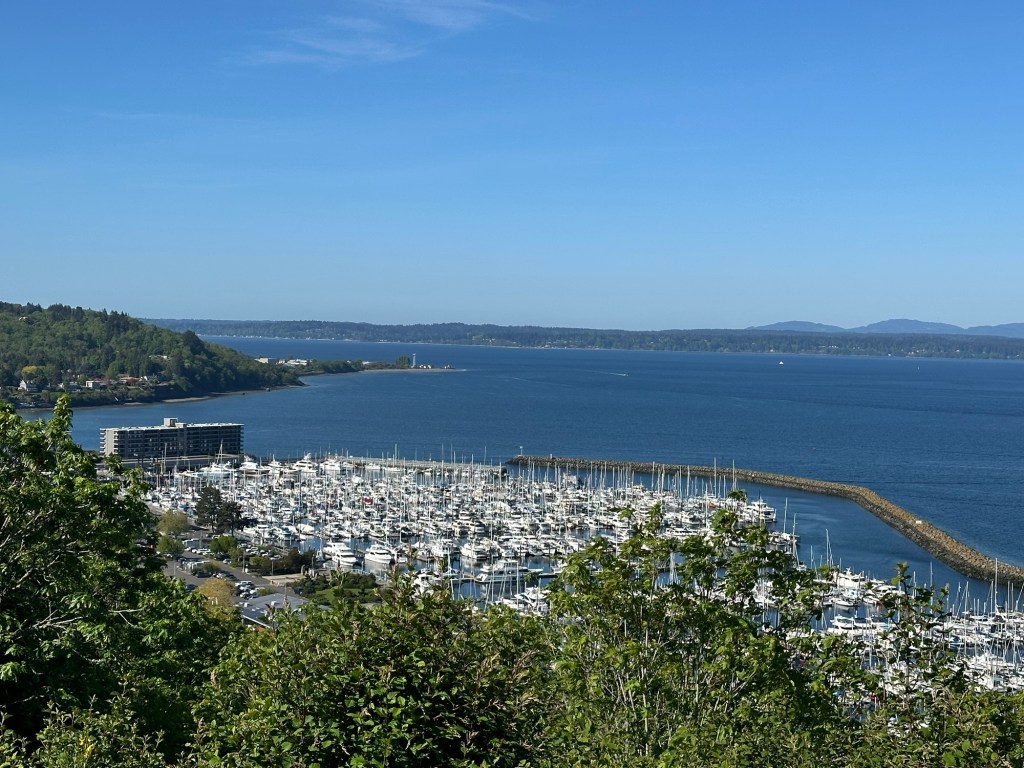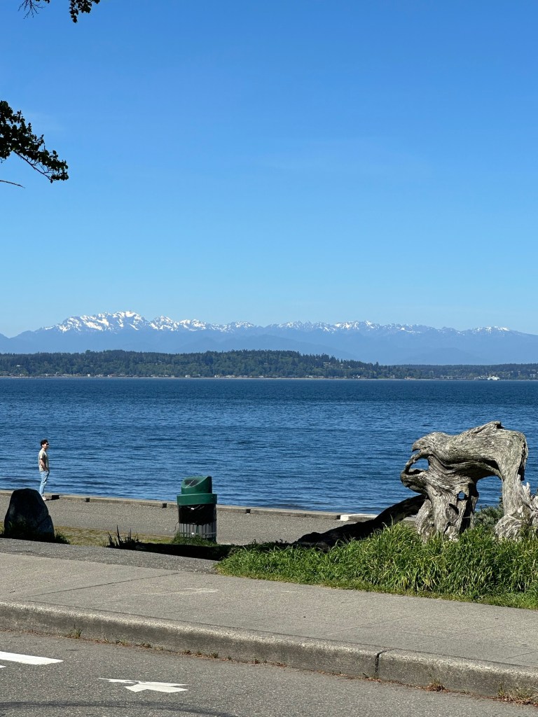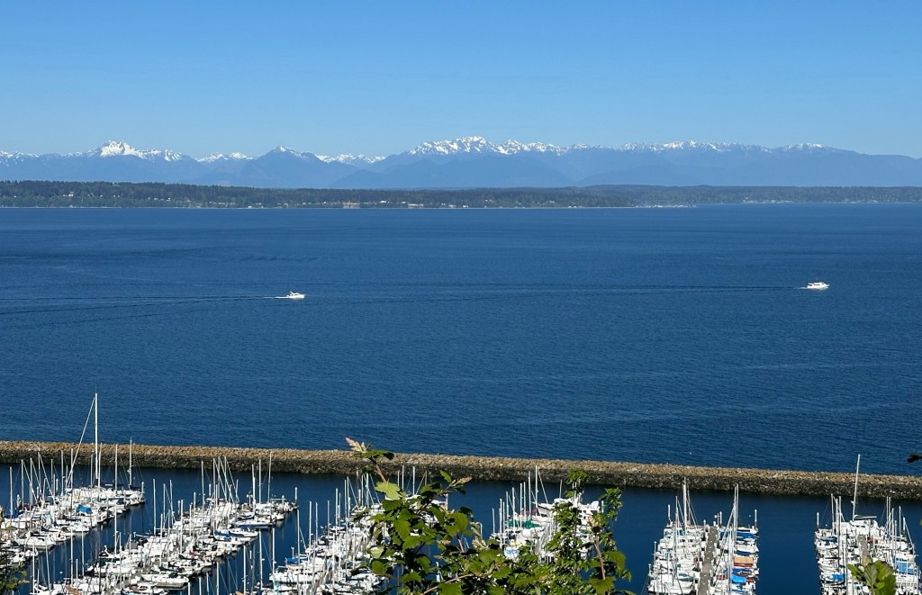 After John and Bowman picked me up, we went straight home to get as much sleep possible. That wasn’t easy since. I fell asleep on the plane for a few hours, but I was glad to get any sleep. Thursday was go to be a half day of work, but before we went into the office, we stopped a few places. First, we went to Sunset Hill, which is not far from Julian. It was a beautiful place to see Puget Sound and the Olympic mountains. Wecould see where our Celebrity cruise-ship from last year‘s Alaska trip was docked. The weather was amazing – blue skies, sunny and warm surprisingly.
