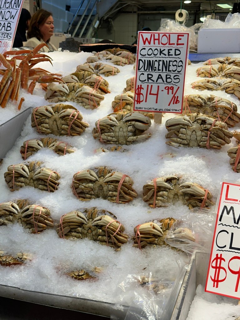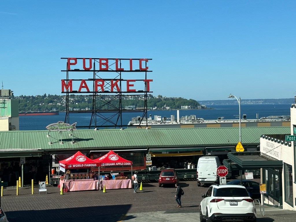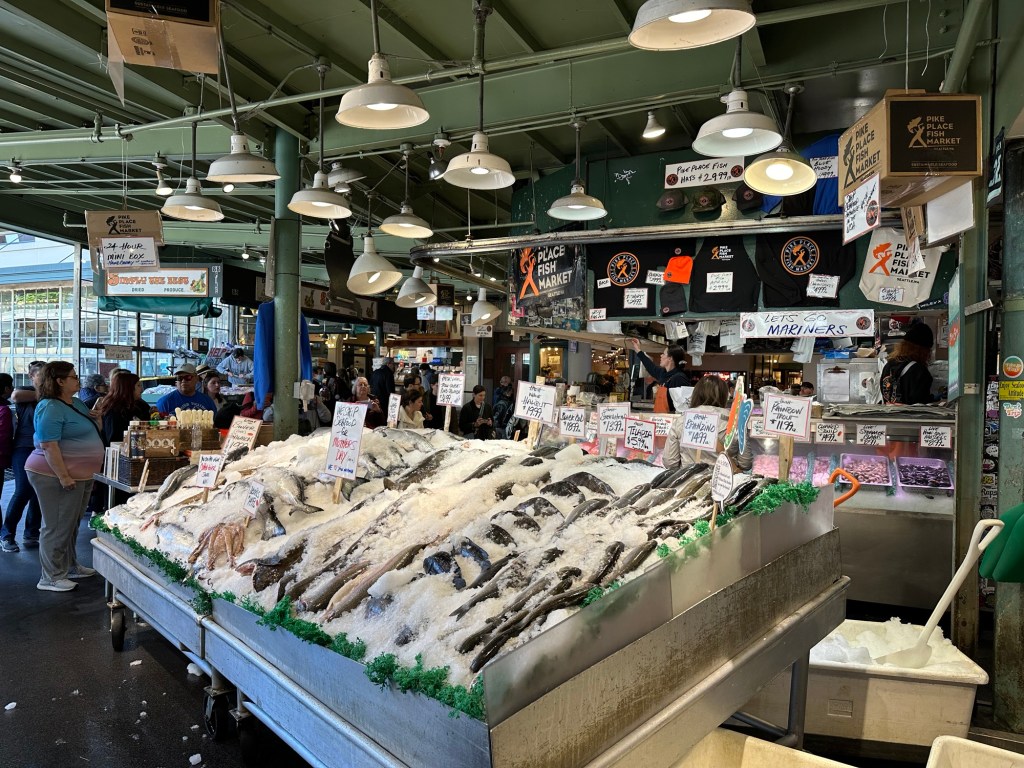 Our next stop was Pike Place Market to get some chowder. Well, at least we got Bowman chowder. I couldn’t find exactly what I wanted and ended up with lentil samosas and a Moroccan lamb pie. But we got to see the fish flying through the air, and it was a cool market.