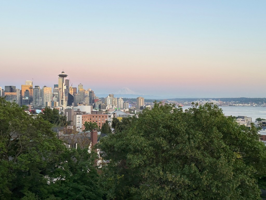 For dinner tonight, we went to Cutters Seafood in Seattle with Julian and Natalie. There was a beautiful view from the restaurant, but the food was just OK. After dinner we drove to Kerry Park, which had a beautiful view of Seattle and Mount Rainier. It was a little hazy, but you could still see the mountain. Do you see it?