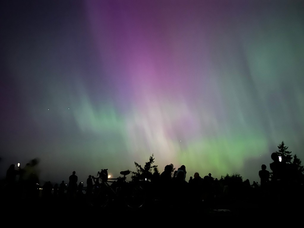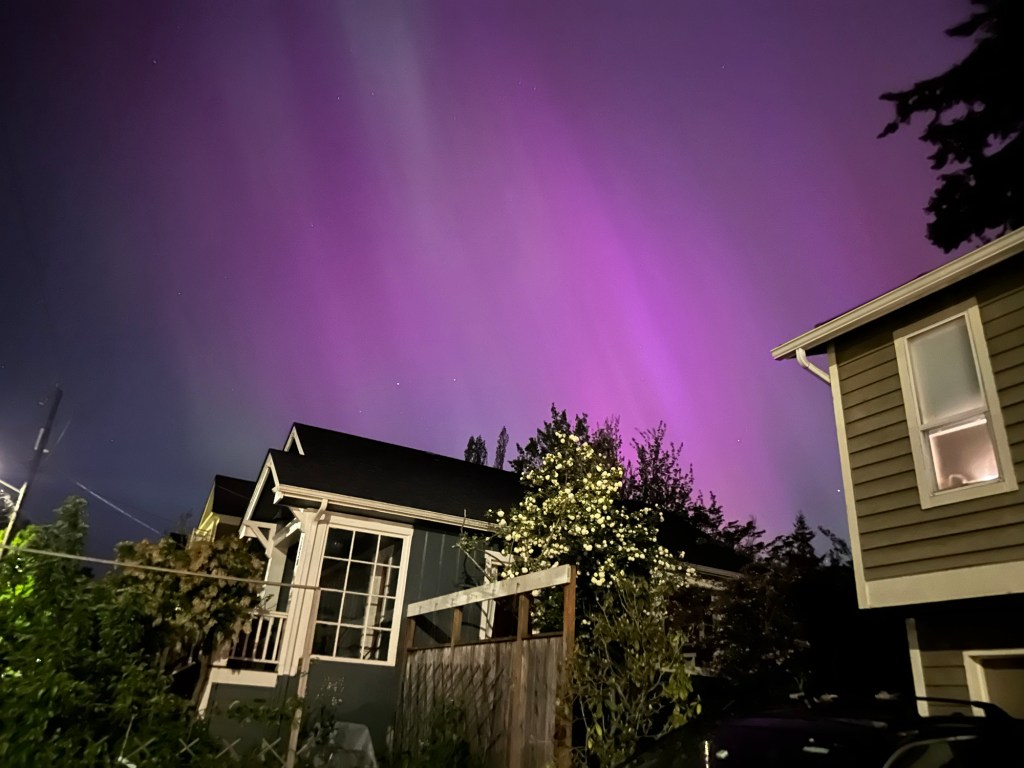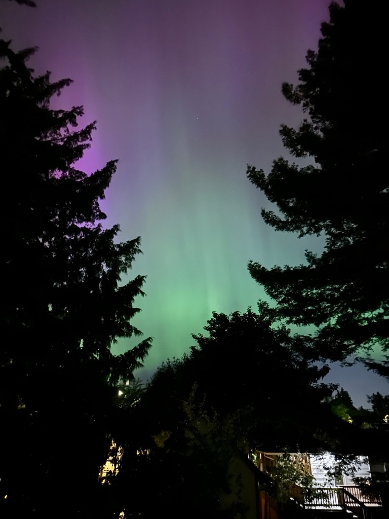 We learned earlier in the day that there was a possibility the Seattle area was going to see the aurora borealis tonight. This was shocking to us, and when we heard the best place to view was either two or three hours away, we had little hope of seeing anything. Around 10:45 we went outside in the backyard to see if we could see anything. And we didn’t say anything. But I decided to take a quick picture and what the heck. What you couldn’t see with the naked eye was quickly captured in a camera. These are some of our photos. It was absolutely amazing.