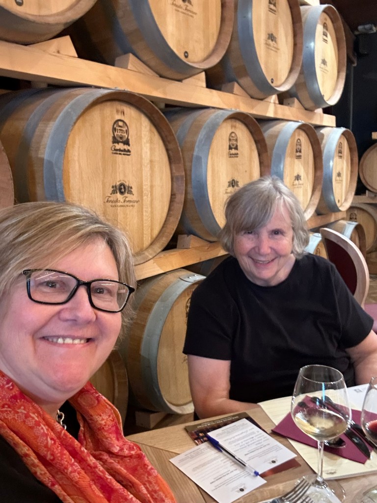 Our first winery was called Tenuto Torciano. We were a little concerned when we pulled up and saw buses in the parking lot for fear that this was a giant group tour place to visit. Some of the signage could’ve been better because we had no idea where to go to check in or start our lunch. Yes, we had a light lunch with our tasting. Well Mom’s tasting not mine. I was excited to taste the olive oil and balsamic vinegar. After asking 4 people where do we go, the last person we asked, walked us to the reception area. Our light lunch consisted of Mom tasting 8 types of wine, which included five whites, a rosé and a Chianti. Her favorite bottle was Vermentino, with the blue peacock on the label. Our light lunch wasn’t very light. It included a plate of Tuscan, salami, cheese, lasagna, tuscan ribollita, and something similar to biscotti, but smaller called cantuccini. It was quite tasty.
