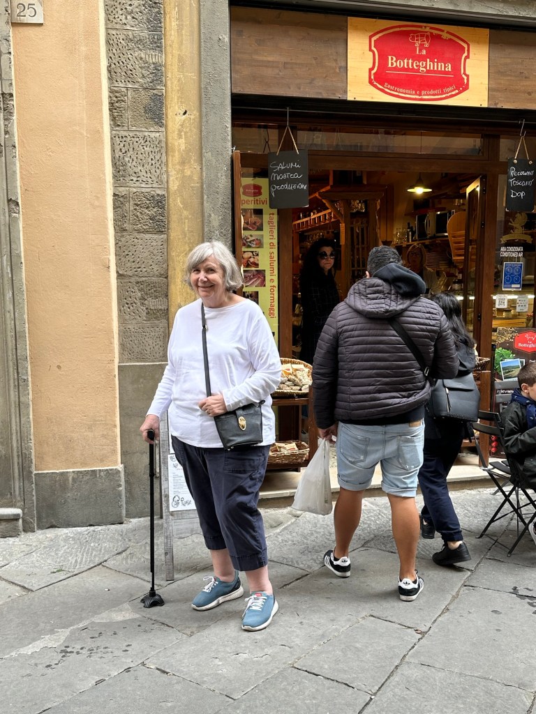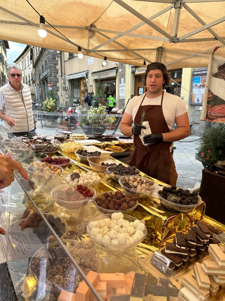 Because it was Saturday, the square also had tents up selling things such as fruits and vegetables, chocolate, cheeses, salami, clothes, dried fruits, spices, Tuscan jams, honey, etc. you could even buy a Porchetta sandwich. So if you had to guess what I bought, what do you think it was? Yes, chocolate, cheese, and some dried fruit called pomelo that I can only find in European countries. Carol Allen got me hooked on it while we were in Cyprus.