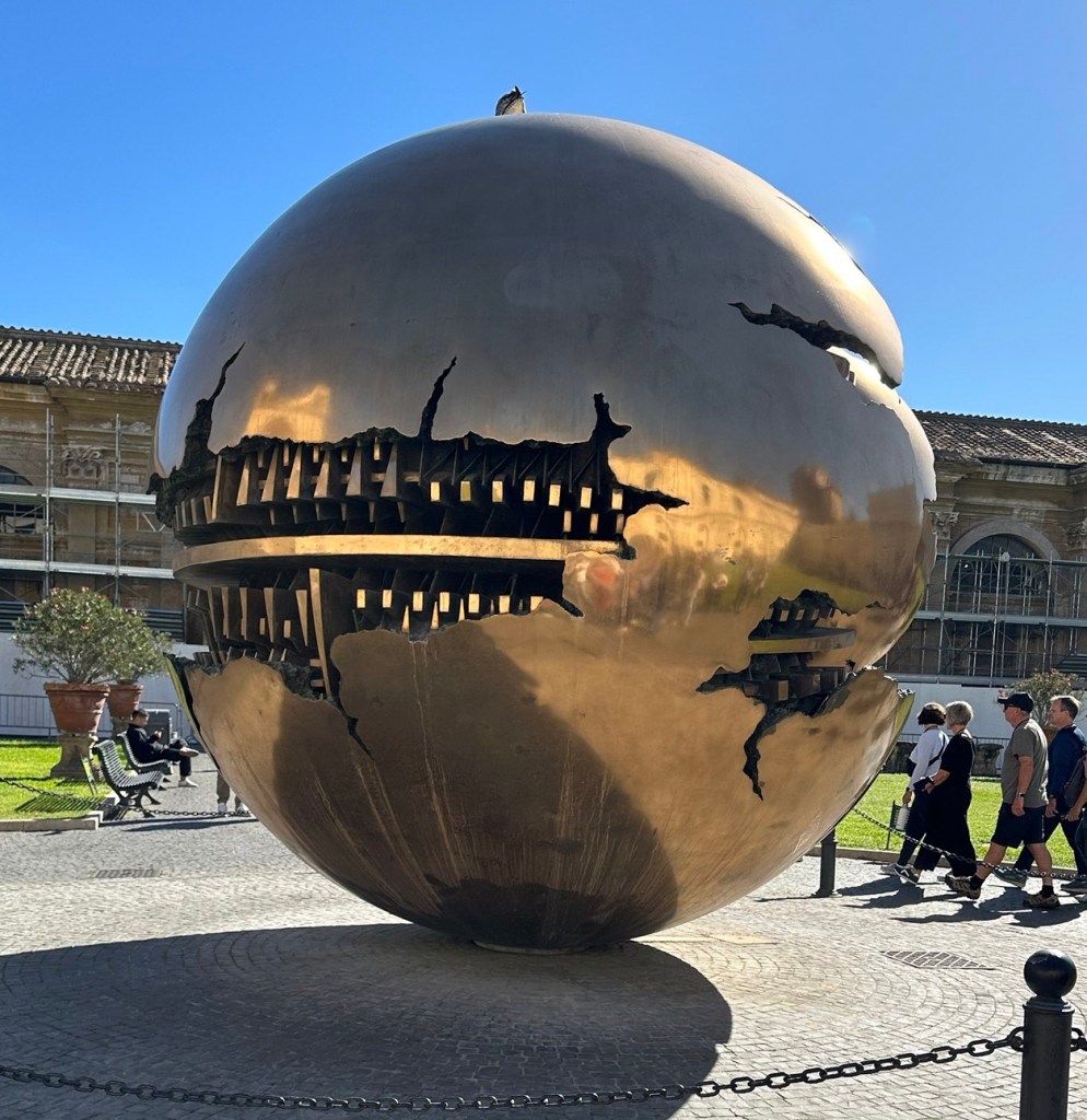 One of these living artists whose work is on display in the Vatican museums is the 93-year-old Arnaldo Pomodoro. His bronze Sphere within a Sphere known in Italian as Sfera con Sfera is a very striking bronze sculpting in the Pine Cone Courtyard (Cortile della Pigna) on display in an outdoor area within the Vatican Museums.