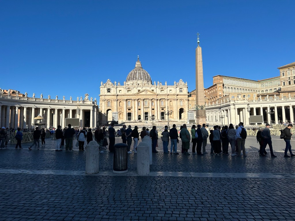 We started our day trying to catch a cab at 8:15 to take us to the meeting point of our Vatican tour, which was organized by Get Your Guide. The local vendor was Barcelona International Travel, which didn’t seem that local. We tried ordering the taxi three or four times and they kept telling us nobody was available. So we made the hike which was about 1.9 kilometers. Fortunately, it was downhill and flat, but unfortunately, it was cobblestone at times. Once we got out of our little neighborhood, we crossed under the railroad tracks, walked across major streets, and then walked around St. Peter’s Square. I had attempted to contact them multiple times yesterday and this morning about meeting them at St. Peter’s Square assuming that was where our tour started. They didn’t get back to me until we were passed the square. And basically said no, you have to come here. With no explanation. And then we waited. I don’t know 20 minutes for people to show up that we’re running late and then they never showed up. our guide showed us pictures of the Sistine Chapel and explained that we wouldn’t be able to talk in the chapel so this is the best way to describe what we’re going to see. We entered the building at the Vatican Museum entrance, which was actually closer to the tour meet up location. We could see lines lines that never ended. We were concerned that we were going to have to get in that line, but we didn’t have to fortunately.