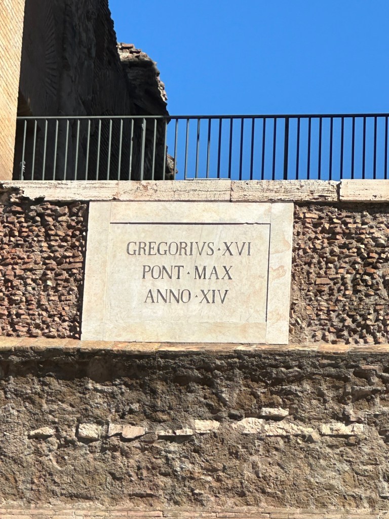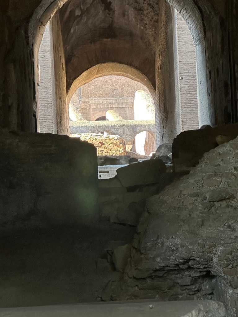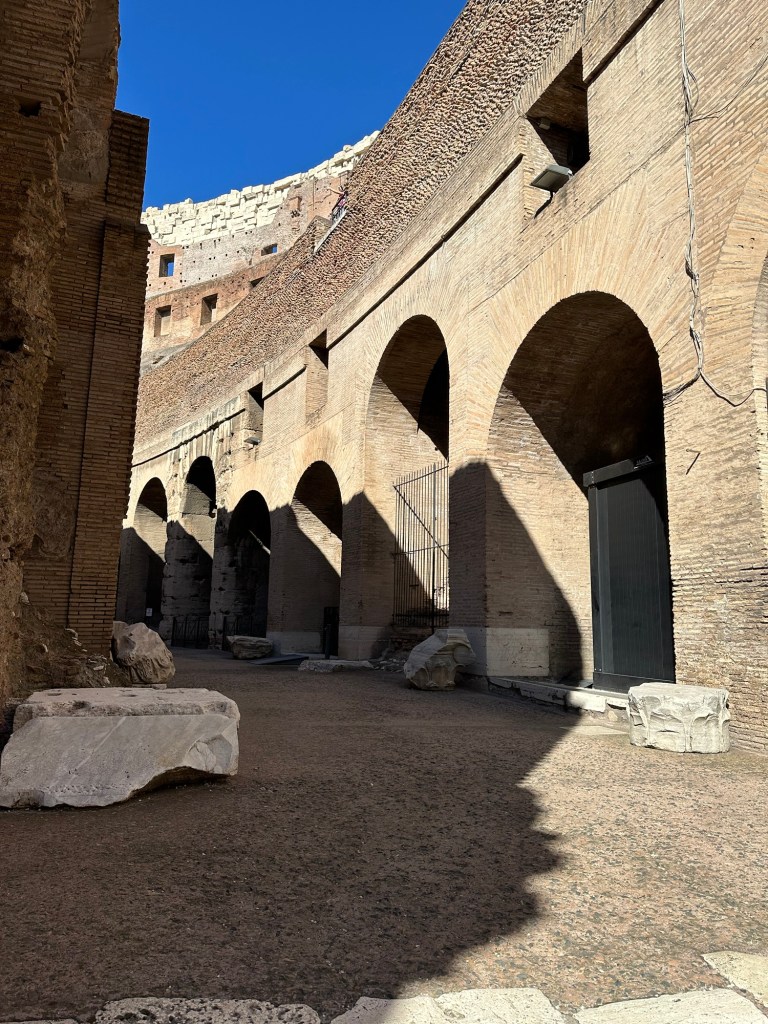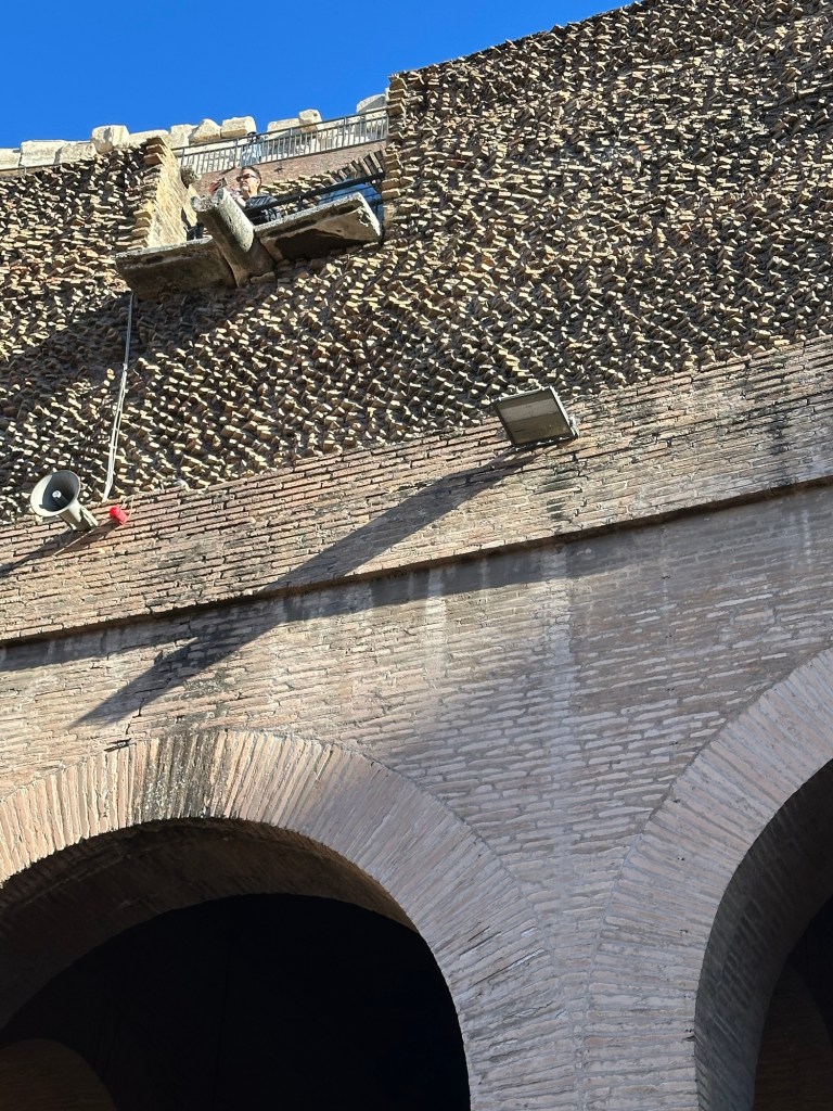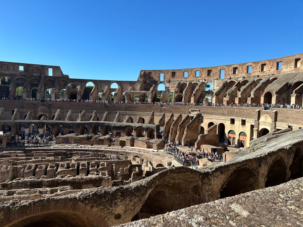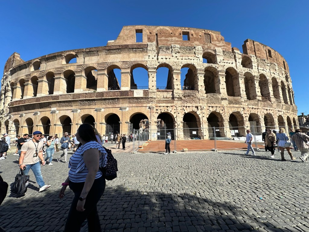 This morning we got up bright and early to catch a cab for an 8:30 tour of the Colosseum. The taxi services here have been somewhat challenging. There’s been times when we’ve luckily caught some, times when we’ve been overly charged, and times when we can’t get the taxi. We started messaging the taxi company at 7:15 am, and at 7:43 they told us they’d be 11 minutes. By the time we actually got to the meetup place it was around 8:40. We know that we were going to be late and I had attempted messaging the company, that didn’t help. When we found the Walks of Italy people they gave us our tickets and we went back down to the Colosseum to use them. Well, that didn’t work. They must’ve used our tickets on somebody else which means we had to buy tickets. And you know there was a line to buy tickets right. So we bought the tickets went back through security. The one guy had seen us before, so he was nice to just let us go through, but we still had to go through the metal detector. The other challenge sometimes with some of the places we go to is they don’t give you a map. And we didn’t get a map today either. But we had an audio tour that we downloaded while we’re sitting in the ticket line, and we used it a couple times. There were a number of English-speaking tours, so we listened in on some of their tour guides speaking.