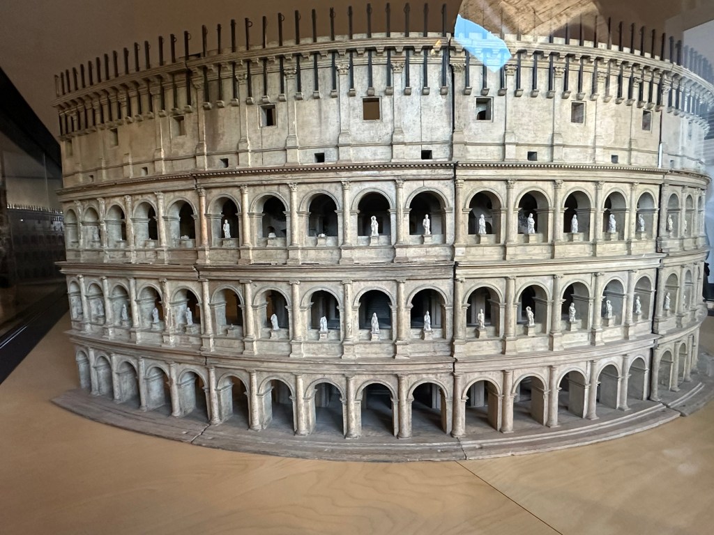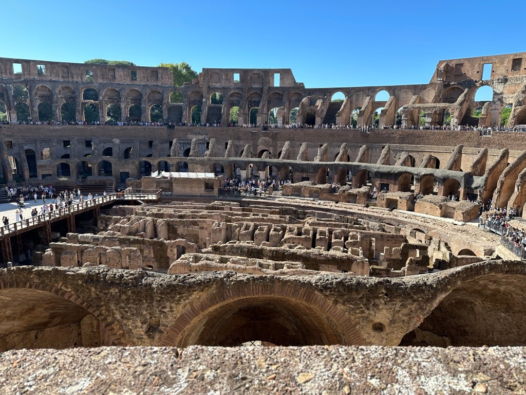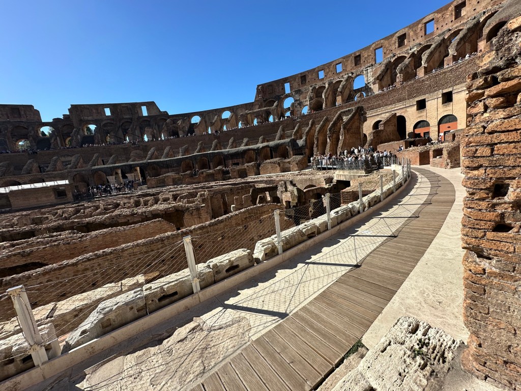 The Colosseum is a site to see. We had really good weather today. So we were able to do as much as we could at the Colosseum. We were fortunate to find a lift. Because damn those steps are pretty steep and that was not gonna happen. The arena is huge. Throughout the visit, we were happy to find the displays in multiple languages, including English. On the second floor it was really cool to see everything, including where they would sit. It’s amazing that it fits 80,000 people. There are a few NFL stadiums that are either the same size or larger, including AT&T Stadium (Dallas Cowboys), Lambeau Field (Green Bay Packers) and MetLife (Giants), there are many other NCAA football fields that hold up to 108,000.