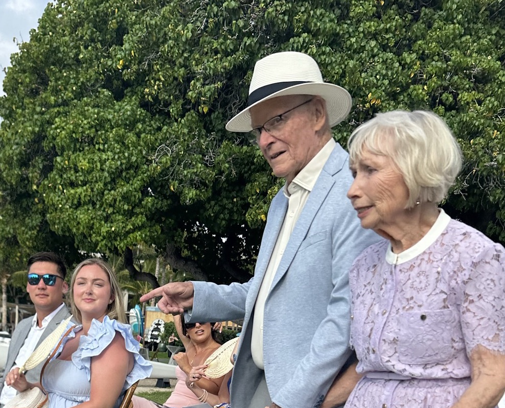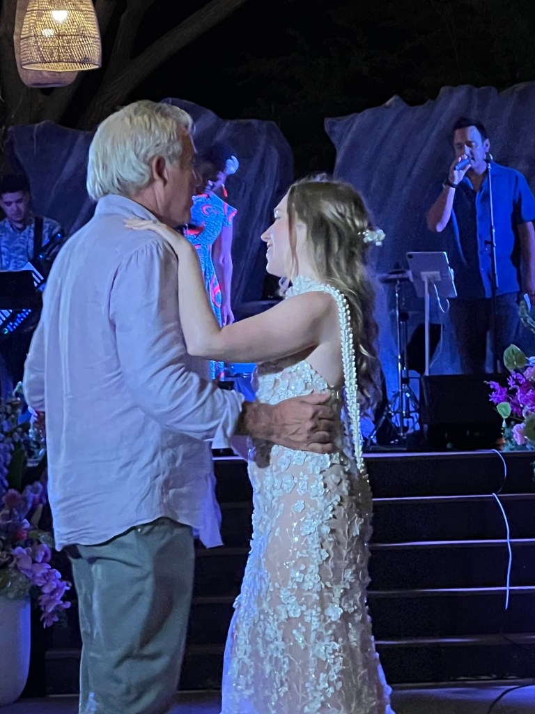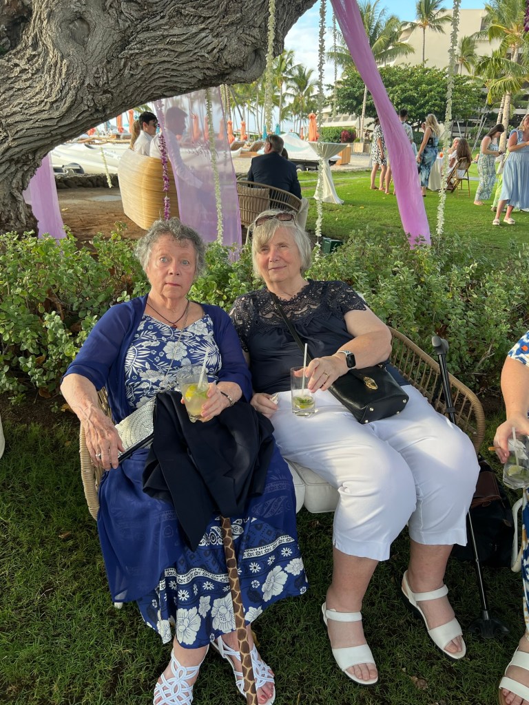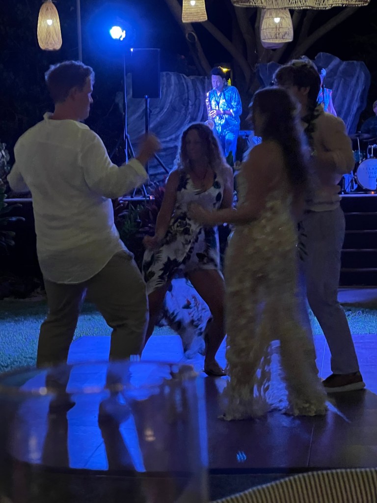 Bowman made arrangements with the wedding planner for a golf cart to take us to the wedding location when we arrived at the hotel. I thought that was available to everyone, but it was us in just a few others who needed help. The wedding was next to the beach, there was grass in an huge Milo tree with fabric and flowers, floating off of the tree. We were able to sit in the shade and just chill until we need to go to our seats.