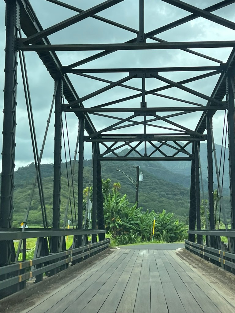 Stopped at the Hanalei Valley Lookout to get some photos of the fields of tarot in the mountain. They also found Elvis, well an artist was painting a picture of young Elvis, which they knew Ginger would like. Near the lookout they found a one lane metal bridge that they drove over.